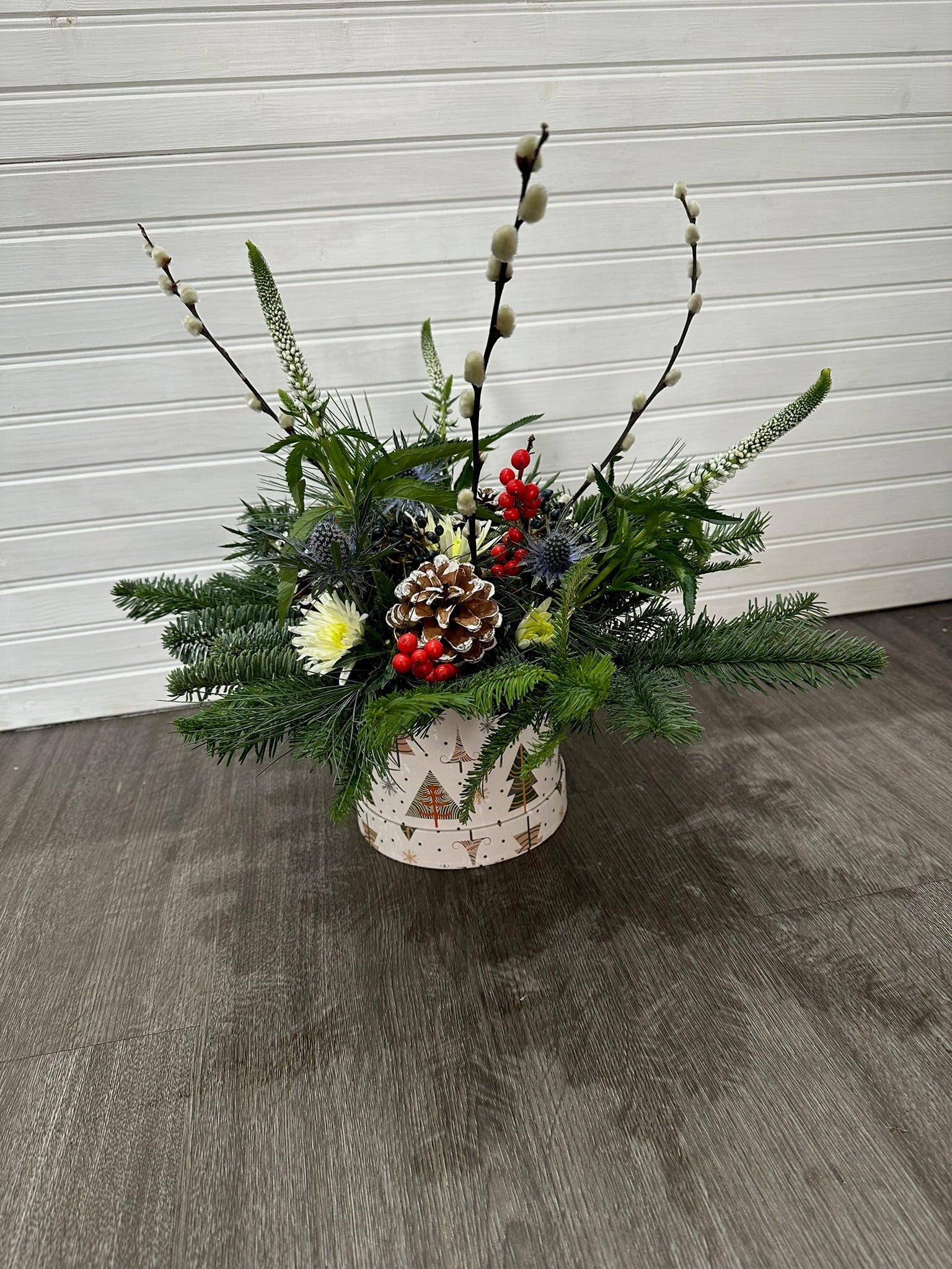 Festive Fresh Flower Hat Box — a luxurious celebration of the holiday season. This beautifully arranged hat box is filled with the freshest flowers of Christmas, combining rich reds, winter whites, lush greens, and seasonal textures for a warm and joyful display. Designed to capture the magic of the festivities, each bloom is carefully selected and artistically arranged to create a stunning, long-lasting centrepiece. Perfect as a gift or as a festive addition to your home décor, this hat box brings the spirit of the season to life with elegance and charm.